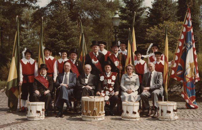 Mierlo - We schrijven het jaar 1978 en we bevinden ons in Mierlo op een groen plekje aan de Geldropseweg. De fotograaf drukt af en hij vereeuwigt het Gilde Sint Catharina en Barbara. Aangenomen wordt dat dit gilde in het jaar 1474 is opgericht. Er zijn meerdere soorten gilden te onderscheiden, de zogenaamde ambachtsgilden een middeleeuwse vakvereniging voor mensen met hetzelfde beroep zoals wevers, bakkers, timmerlieden en smeden. In een dergelijk gilde werden de belangen van de vakgroep behartigd en nieuwe leden opgeleid. Daarnaast bestonden de zogenaamde schutsgilden waarin boeren, burgers en buitenlui zich verenigden met als doel de lokale gemeenschap te dienen dan wel te beschermen, zo nodig door het opnemen van de wapens. Nu genieten schutsgilden voornamelijk bekendheid door de schuttersfeesten. De foto is niet van totale gilde, maar alleen van de vendeliers en de tamboers, met de overheid van het gilde, en het college van B&W van de gemeente Mierlo. Ze zijn hier op bezoek bij dhr de Jonge, Gildenheer. Hij is de man derde van links op de eerste rij. B&W wordt vertegenwoordigd door burgemeester Jo van Lokven, en de wethouders Nico van de boomen en dhr. brilman. Voorste rij (4e van links, met gildeonderscheidingen) is Gerard H. Scholtens uit Mierlo.