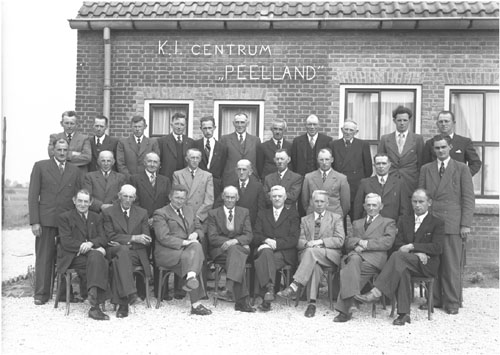 Een kolossale fokstier, die voor veel nakomelingen in Peelland en misschien ook wel daarbuiten heeft gezorgd. Kunstmatige inseminatie wordt al vele jaren toegepast in de veeteelt. Voor het fokken van koeien en varkens in de vlees- en melkindustrie wordt bijna uitsluitend met kunstmatige inseminatie gewerkt. Slechts weinig veeboeren hebben zelf nog mannelijke dieren. Gespecialiseerde bedrijven houden bepaalde stieren en beren met de gewenste erfelijke eigenschappen. Die kwaliteiten worden doorgegeven aan hun nakomelingen door ze te kruisen met die van daarvoor geselecteerde vrouwelijke dieren uit de regio. Zo ontstaan betere rassen met een hogere opbrengst. In Peelland bevindt zich een KI-Station aan de weg van Lierop naar Mierlo. Daar werd op een goede dag dit gezelschap op de foto gezet. Maar wanneer? En bij welke gelegenheid? En wie zijn deze heren? Weet u het? Laat dan een bericht achter via het onderstaande reactieformulier. |