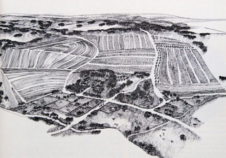 Voorbeeld van een Middeleeuws domein met in het midden de hoeve van de domeinheer, daarachter zijn landerijen en rechtsonder het dorp van de boeren met de kerk.