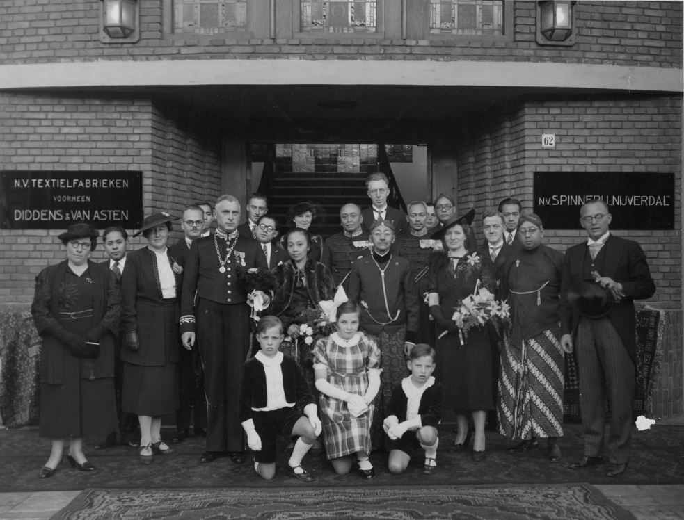 Op de foto is het gezelschap met leden van de familie Van Asten te zien bij de ingang van de textielfabrieken van Diddens en Van Asten aan de Kanaaldijk Noordoost. Bent U nieuwsgierig naar de lunch die de hoge gasten aangeboden kregen? De lunch werd verzorgd door cuisinier Van de Vliert uit Helmond en bestond uit vijf gangen: aspic van forellen; bouillon; getruffeerde kalkoenkuikens met maderasaus, gebraisseerde cellery en geboorde aardappeltjes; sandwiches; ijs met perziken. Daarna werd de gasten nog koffie aangeboden.