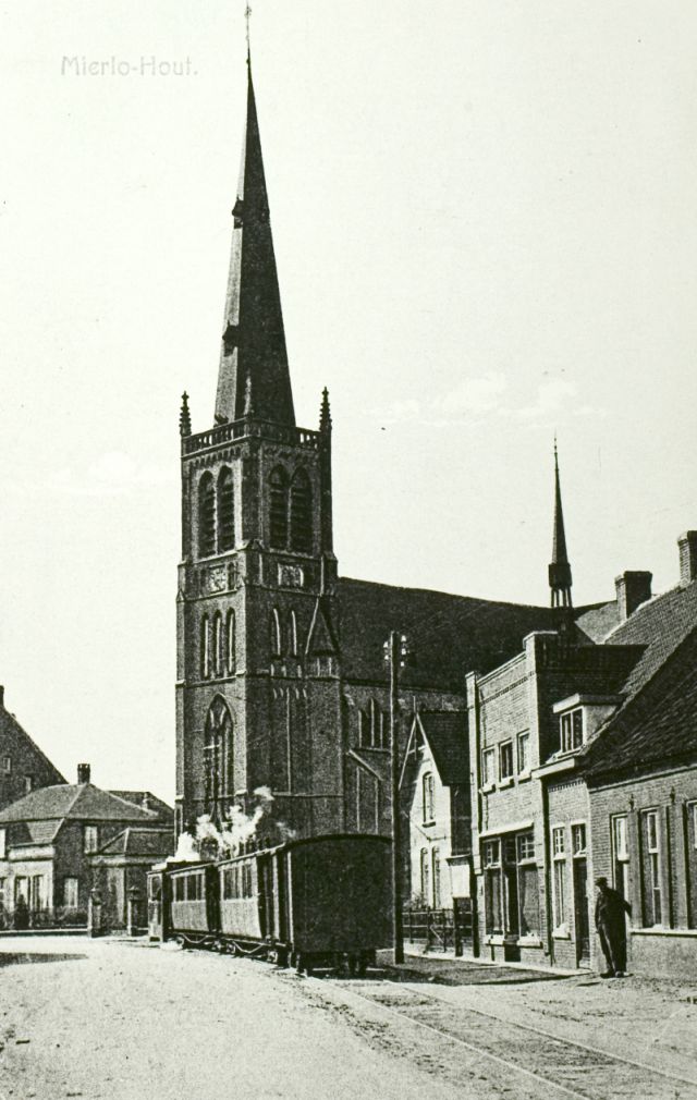 Veel is nog onduidelijk over de oudste geschiedenis van Mierlo-Hout, maar duidelijk is wel dat het een interessante geschiedenis is. Beide foto’s zijn van de Hoofdstraat. De eerste is genomen in 1929 en toont de Luciakerk, juist op het moment dat de tram passeert. De tweede geeft een zeer landelijk beeld uit 1942. Met op de achtergrond de molen, is een vrouw een koe aan het melken.