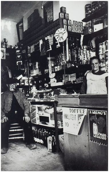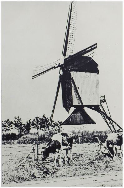 Op de eerste foto zijn twee koeien te zien aan de voet van de windmolen aan de Hoofdstraat. Een van de koeien wordt gemolken door een jong meisje dat half verscholen achter de koe op haar melkstoeltje zit. De tweede foto toont het interieur van een typisch dorpswinkeltje waar van alles te koop is, tabak en drank, maar ook roomijs en eierbeschuit. Het is het winkeltje van Willem van Beek aan de Hoofdstraat. Links zit Willem op een krukje. Zijn dochter Nelleke staat achter de toonbank. De originele foto’s zijn in particulier bezit. Dit zijn slechts de reproducties.